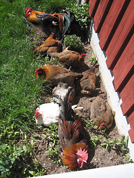 En höna som visat stort intresse för att ruva har fått en hög ägg att passa. Om allt går bra, äggen är befruktade och hon inte ångrar sig så borde det bli kycklingar till pingst. Solen gassade hela dagen och Maria kostaterade att hon inte längre har problem med ogräs i rabatterna. Med tio höns som solbadar längs väggen så blir det inte mycket kvar!.