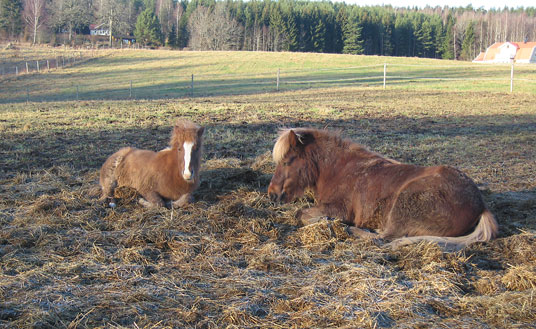 Från vintern till vår på några dagar! Solen kom äntligen men det är flera grader varmt så det är lerigt i vinterhagen. Hästarna uppskattar verkligen solen och de låg och sov i den halm som vi lagt ut i hagen. Hlín och Eir verkar trivas mycket bra ihop och precis innan bilden av slapparparet togs låg även Vilja där och sov.