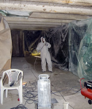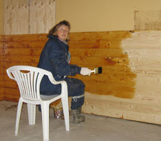 Arbetet i stallet består just nu bara av att kalka innertaket. Kalk är visserligen både billigt och bra men att spruta kalk är en kladdig sysselsättning. Det går åt en hel del skyddsutrustning för att inte insidan av kroppen ska bli kalkad också!