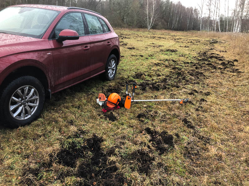 6 januari. Nu är det slut på ledigheten. Snöfritt och torrt så det blev några dagar i skogen med motorsåg och röjsåg. Några fallna björkar och massor av salix i träsket. Offroadläge på bilen så går det att köra fastän vildsvinen bökat intensivt.