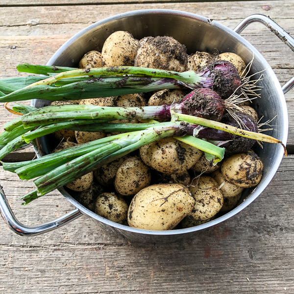 22 Juni. Midsommar - blåsigt och svalt. Den extrema värmen under maj och fram till nyligen gjorde att vår egen potatis blev tidigare skördeklar än normalt. Löken verkar också klarat torkan, däremot har vi ingen sallad alls utom portlak som blivit bra där den lyckats gro.