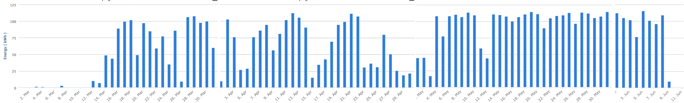 9 Juni. Rekordtidig vallskörd avklarad. Vi har lerjordar som håller fukten ganska bra men trots det så märks det att vi inte fått regn på länge. Skörden blev mindre än tidigare år så vi tar kanske en andra skörd. Strålande sol och 25-30 grader under hela maj och hittills i juni gör att gräsmattorna börjar gulna. Enda positiva är att solpanelerna ger mängder med el. Nästan varje dag har vi producerat över 100 kWh.