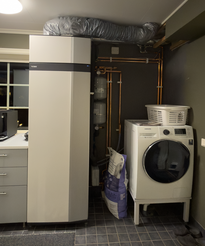 December - Nu är bergvärmesystemet på plats. Tvättmaskinen fick flytta sig och hamna upphöjd för att ge plats för rören under. Det enorma badkaret åkte ut i samma veva och utkastaren på ytterväggen som alltid kärvade byttes också. Nu tar vi julledigt från hantverkare. Men nästa år så ska bergvärmeinstallationen kompletteras med kyla till sovrummet.